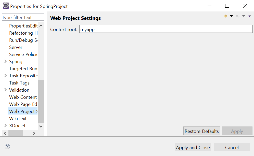 urlμ myappμ μ§μ°λ €λ©΄ Project μ°ν΄λ¦ -> Properties -> Web Project Settings μμ Context rootλ₯Ό /λ‘ λ°κΎΈμ΄ μ€λ€.