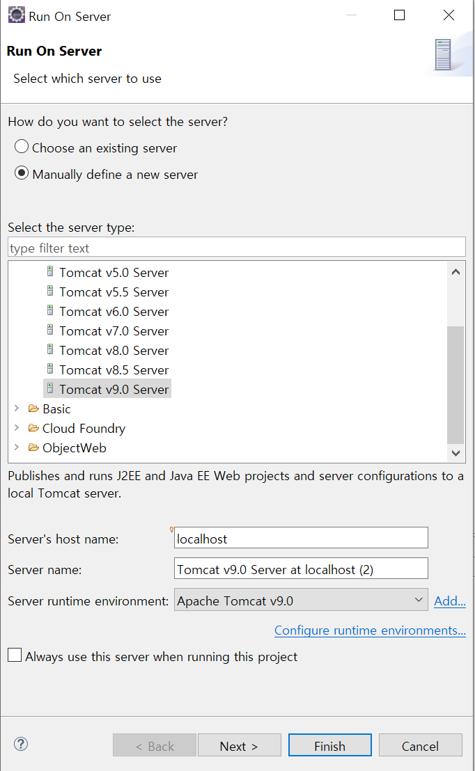 κ·Έ λ€μμΌλ‘ μμ μ Spring λ²μ μ λ§λ Tomcatμ μ§μ ν΄μ€λ€. κ·Έλ¦¬κ³ Finishλ₯Ό λλ₯΄κ³ μλ²κ° μ€νλκ³ μΉ λΈλΌμ°μ μμ localhost:8080/myappμΌλ‘ μ΄λνλ©΄ Hello Worldκ° νλ©΄μ 보μΈλ€.