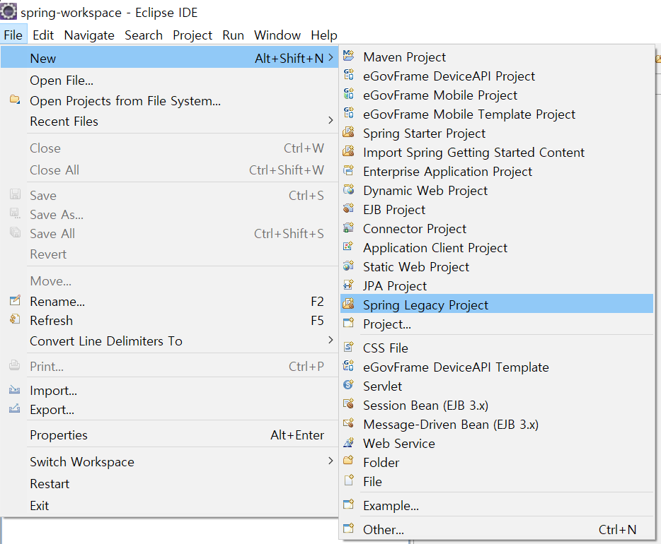 μΌλ¨ νλ‘μ νΈ μμ±μ μν΄ Eclipseλ₯Ό μΌκ³ μΌμͺ½ 맨 μμ μλ File -> New -> Spring Legacy Project λ₯Ό μ ννλ€.