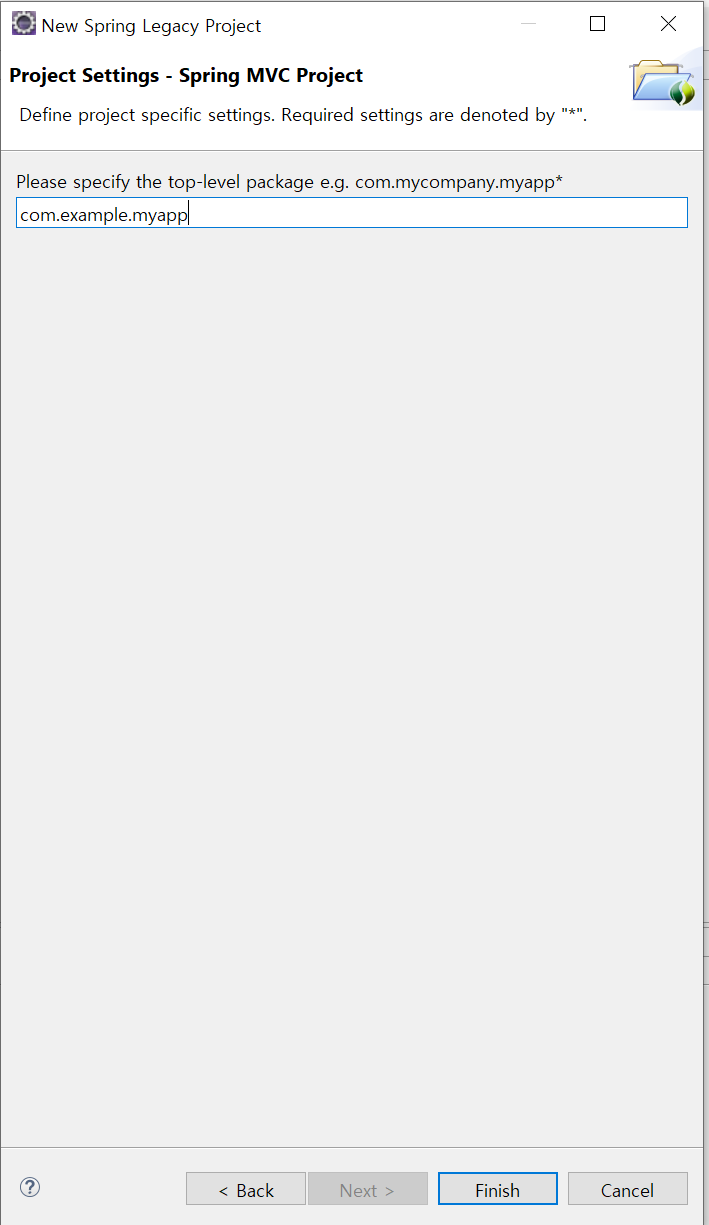 λ€μμΌλ‘ ν¨ν€μ§ μ΄λ¦μ μ§μ νλ©΄ λλ€. λ³΄ν΅ 3λ¨μλ‘ μμνκΈ° λλ¬Έμ com.example.myappμ λ£μ΄μ£Όλλ‘ νλ€. κ·Έλ¦¬κ³ Finishλ₯Ό λλ₯΄λ©΄ νλ‘μ νΈκ° μμ±λλ€.