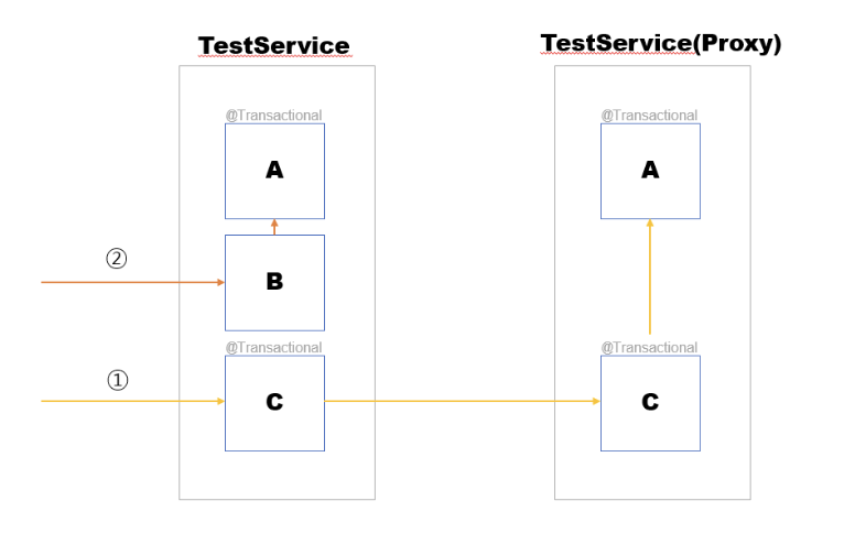 β C λ©μλλ₯Ό νΈμΆνλ©΄, TestServiceκ° μλ TestServiceμ νλ‘μμ ꡬνλ C λ©μλκ° λμ νΈμΆλλ€. λ°λΌμ Cμ Cμμ νΈμΆνλ A λͺ¨λ νλ‘μ κ°μ²΄μμ νΈλμμ μ²λ¦¬λ₯Ό ν΄μ€λ€.
